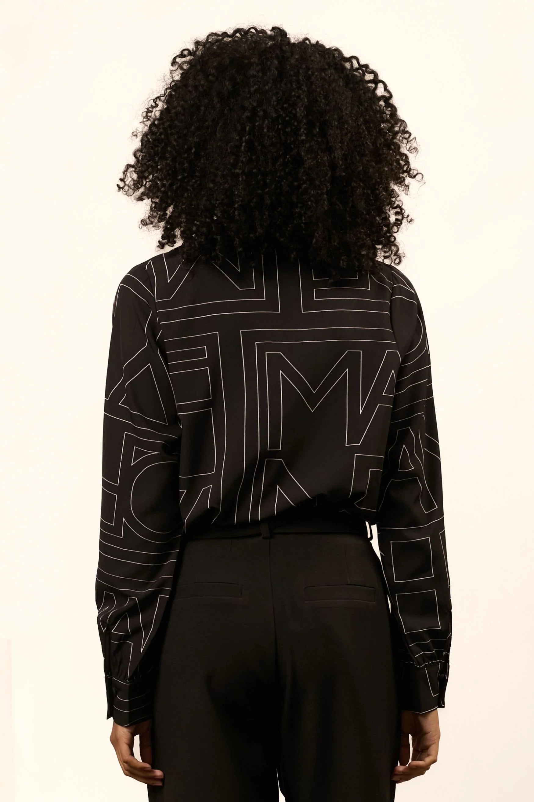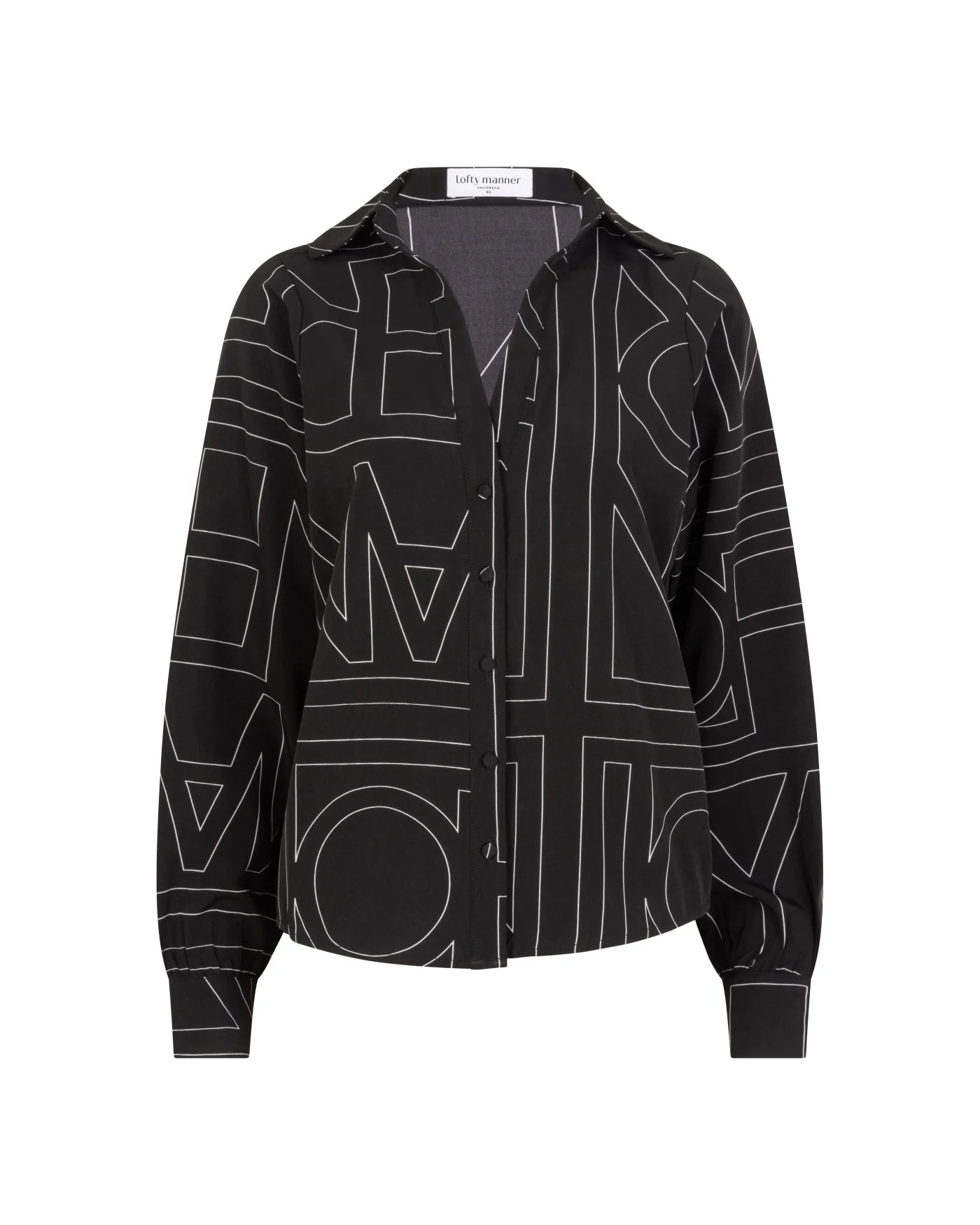 Blouse Eve is een klassieke zwarte blouse met grafische print. De blouse met V-hals heeft knoopjes over de gehele lengte en knoopjes bij de mouwuiteinden. De zwarte blouse is qua pasvorm losvallend.