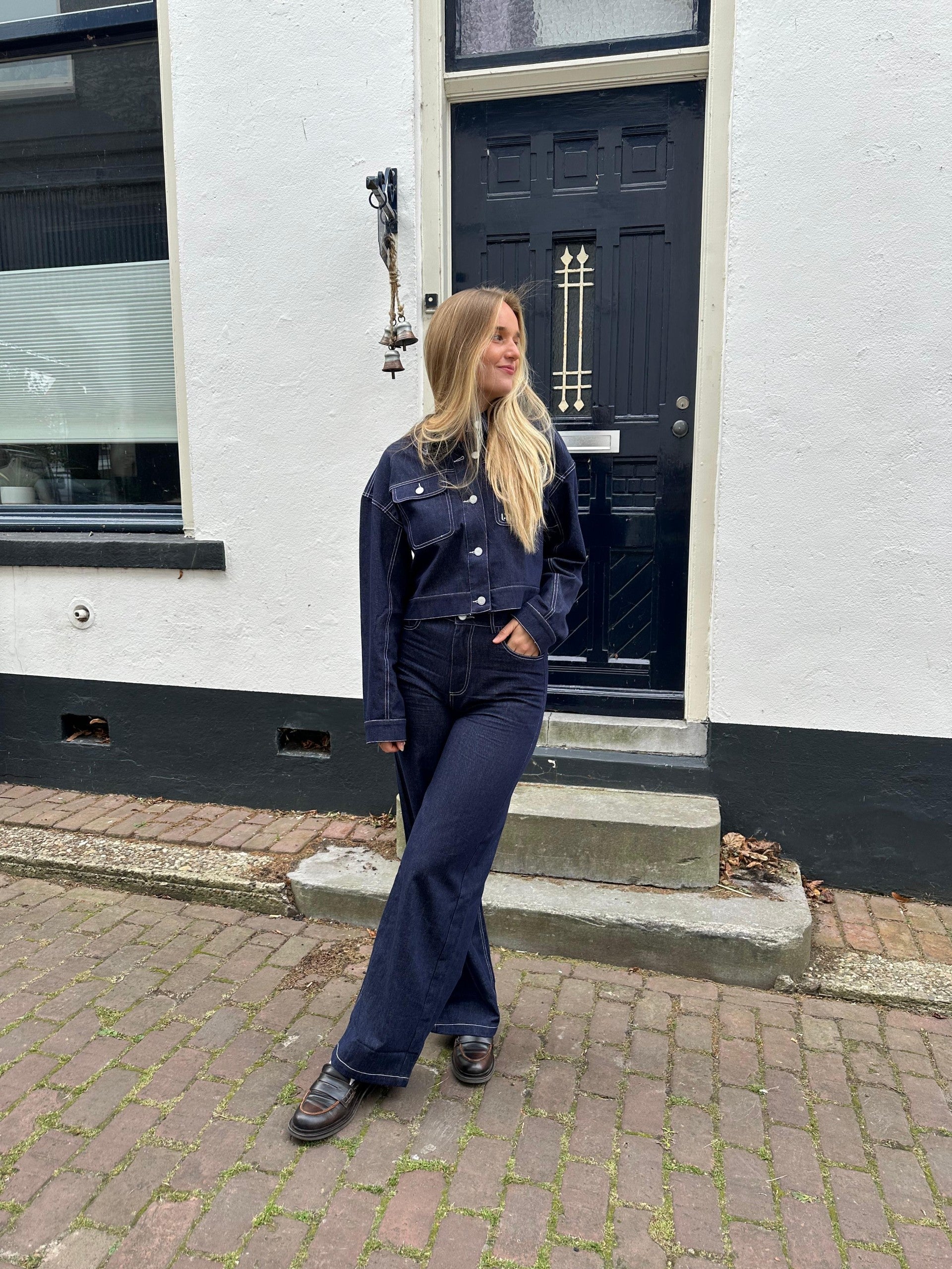 Broek Valluna is een rechtvallende jeans met contrasterende stiksels. De jeans heeft denim zakken en een knoop- en ritssluiting.